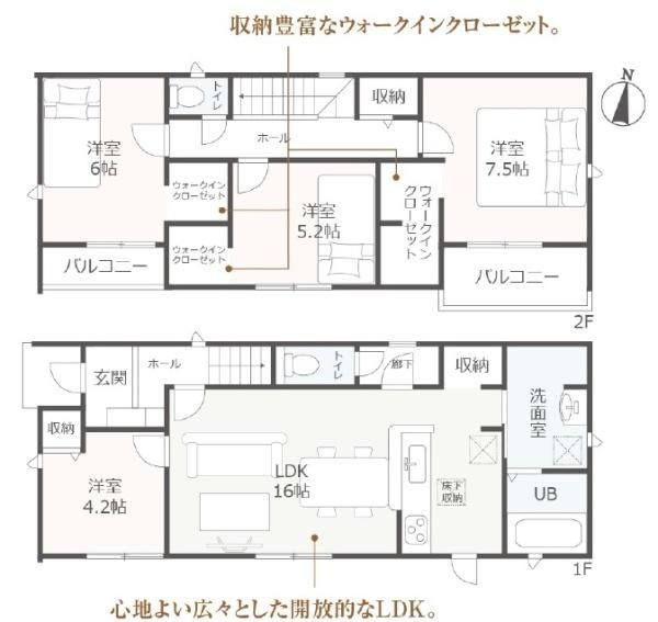 LDK16畳(1F)、洋4.2畳(1F)、洋7.5畳(2F)、洋6畳(2F)、洋5.2畳(2F) |