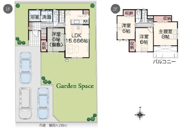 LDK15.6畳(1F)、和6畳(1F)、洋8畳(2F)、洋6畳(2F)、洋6畳(2F) |