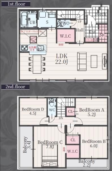 LDK22畳(1F)、洋7.8畳(2F)、洋6畳(2F)、洋5.2畳(2F)、洋4.5畳(2F) |